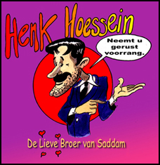 Henk HoesseinHenk Hoessein is de lieve broer van Saddam die nog nooit een vlieg kwaad heeft gedaan en zelfs geen penicilline slikt omdat hij dat onaardig vindt voor bacteriën. Op het hoogtepunt van het terreurbewind van zijn stoute broer moest hij naar Nederland vluchten, waar hij tegenwoordig werkt voor de kinderbescherming en in zijn vrije tijd ouderen helpt met oversteken en zieken bezoekt. Zijn lijfspreuk is: 'Als iedereen over zich heen zou laten lopen, zou de wereld er een stuk beter uitzien'. Zijn Amerikaanse buurman Al Kaida denkt daar hetzelfde over en loopt dan ook vaak over Henk heen. Die heeft daar zo zijn psychologische remedies tegen. De avonturen van Henk en Al verschijnen binnenkort op deze site. |